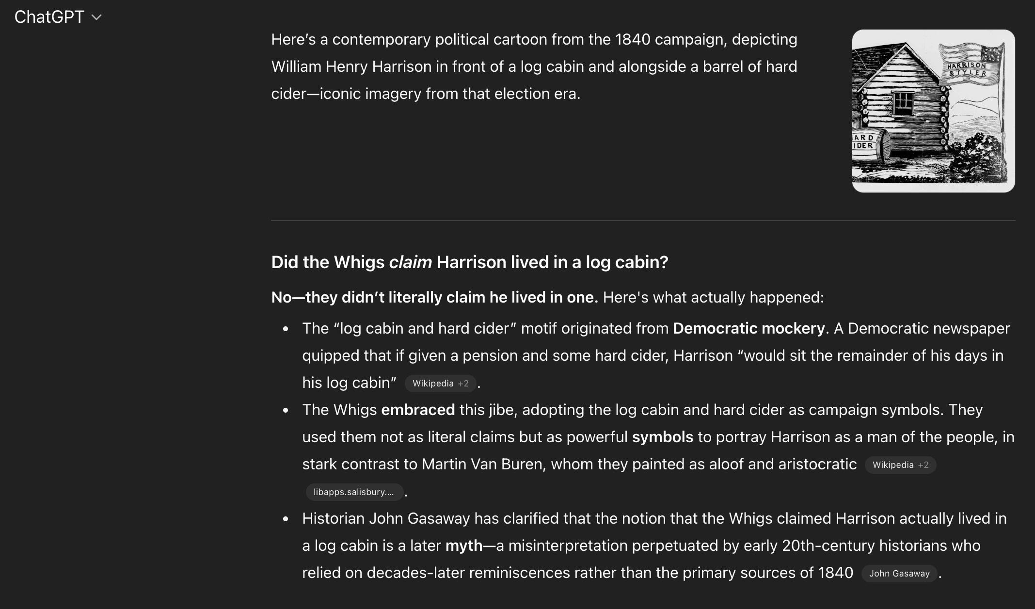 Ultimately what Whigs did or did not say almost two centuries ago doesn’t amount to a hill of beans in today’s world. What matters is striving to be accurate about the past and present. As long as chatbots are properly cross-checked they may occasionally serve as a knowledge accelerant when the traditional appurtenances of scholarly inquiry are proving to be a bit sclerotic.
