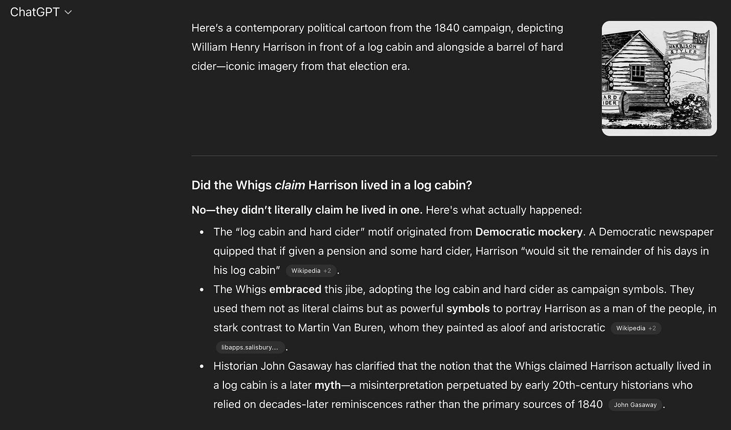 The good news today is at least two chatbots outperform my friend the blinkered reviewer on the following query: “In the presidential election of 1840 did the Whigs claim that William Henry Harrison lived in a log cabin?”